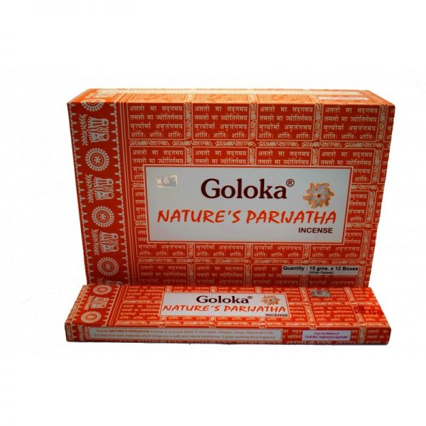 Incienso de la casa Goloka en calidad masala. Está fabricado con flores de parijatha, que tienen un aroma muy dulce y afrutado.