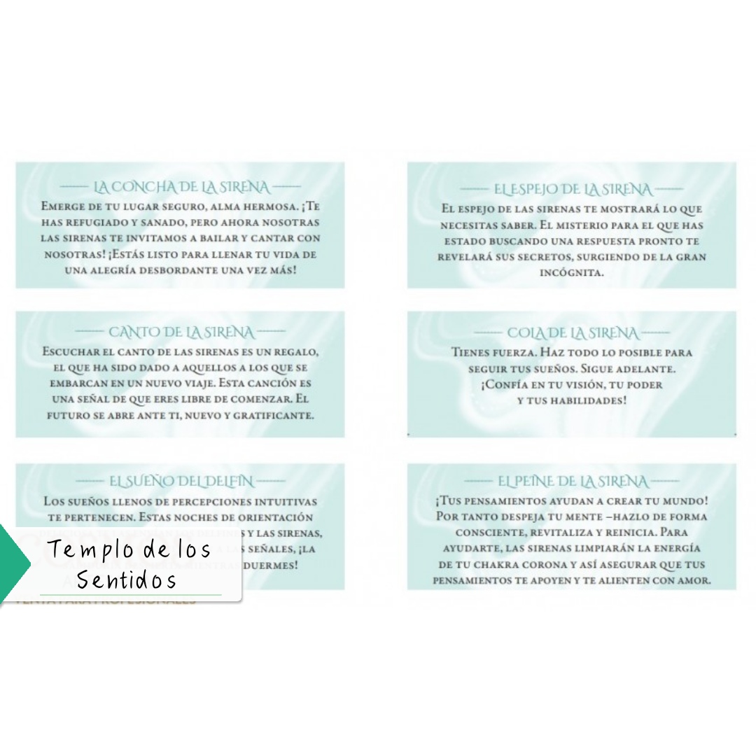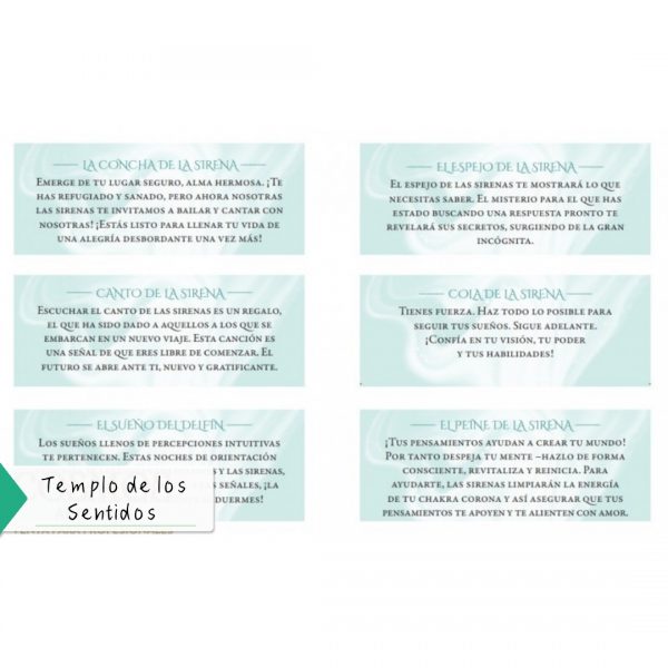 • 55 cartas con mensajes de sabiduría inspirados del océano y de las sirenas. Cada carta está elegantemente iluminada con una estampa de hojas de oro.